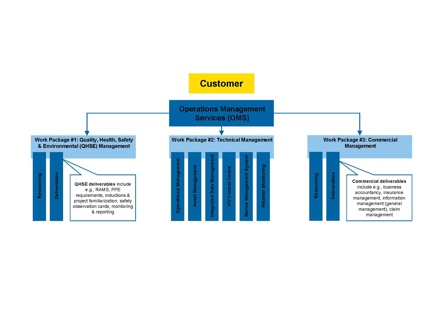 Operations Management Services (OMS) scope consists of up to three work packages including QHSE Management, Technical Management & Commercial Management. Customer can select & tailor the packages based on its specific needs & sourcing requirements.